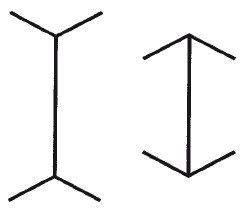 Наиболее известным из рисунков такого рода являются стрелы Мюллер-Лайера, изображенные на рис. 1.10. Это просто пара стрел, древки которых одинаковой длины, но одна стрела имеет наконечники с расходящимися, а другая – со сходящимися к древку концами. Стрела с расходящимися наконечниками кажется длиннее, хотя фактически обе стрелы одинаковой длины. Мы будем называть этот рисунок просто иллюзией стрелы. Второй пример также хорошо известен, и специалисты называют его фигурой Понцо. Он состоит всего из четырех линий: двух одной и той же длины, идущих рядом, но не сходящихся, и между ними двух других, равных по длине и параллельных (см. рис. 1.11). Одна из линий, расположенная в узкой части пространства, заключенного между двумя сходящимися линиями, кажется длиннее, хотя фактически обе параллельные линии одинаковой длины. Мы будем называть этот рисунок иллюзией железнодорожных путей.