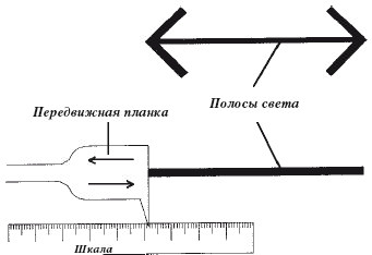 Рис. 1.19. Как измерить иллюзию. Наблюдатель смотрит на стрелу и сравниваемую с ней линию, которую он устанавливает так, чтобы она оказалась той же длины, что и искаженная стрела. Таким образом можно непосредственно измерять степень иллюзии. (Измерение, однако, возможно только тогда, когда иллюзия не является логически парадоксальной.) На рисунке показано, как выглядит аппаратура сзади, со стороны экспериментатора