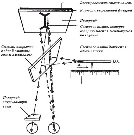 Рис. 1.20. Как измерить кажущуюся глубину изображения. Рисунок (плоский) освещается сзади, чтобы избежать влияния структуры фона, что создает парадоксальное впечатление глубины. Свет от рисунка проходит через поляроид, закрывающий один глаз. Регулируемое испытуемым световое пятно посылается на рисунок путем отражения от стекла, покрытого с одной стороны тонким слоем амальгамы. Это пятно рассматривается обоими глазами и устанавливается испытуемым на видимое расстояние от любой избранной части рисунка. Таким образом с помощью бинокулярного зрения измеряется монокулярно видимая глубина