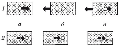 Рис. 1.21. Три экспериментальные ситуации, создающие эффект индуцированного движения. Точка и прямоугольник могут двигаться независимо друг от друга. Сплошные линии указывают физическое движение, пунктирные – видимое движение: а) реально движется только точка; б) реально движется прямоугольник; в) реально движутся и точка, и прямоугольник. Несмотря на это, во всех случаях воспринимаемое движение одинаково: кажется, что движется точка, а прямоугольник остается неподвижным. Три различных физических движения имеют своим результатом идентичное восприятие движения. 1 – действительное движение; 2 – конечное положение и воспринятое движение