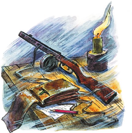 «Что, если подкрадутся фашисты? – думал Митя. – А может быть, придёт волк-людоед? Вот сейчас заскребётся лапами в дверь… Дверь тонкая… И запора нет…» Мите захотелось вскочить, выстрелить в дверь длинной очередью из автомата. Но он не вскочил, заставил себя лежать. И так, лёжа, дождался других мыслей: о том, что он солдат, бояться ему не полагается. Он не просто ночует в блиндаже, он охраняет склад боеприпасов, и горе тому, кто попытается их взорвать или выкрасть. «Пора на пост!» – сказал себе Митя. После этих слов он встал, поставил автомат на боевой взвод и открыл дверь.