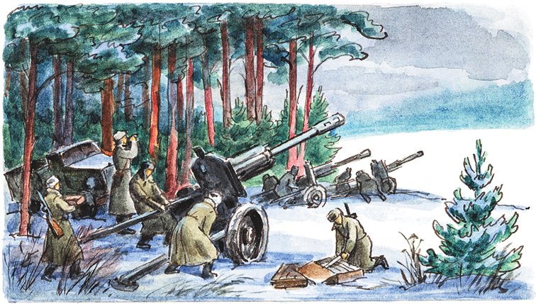 Когда в посветлевшем небе появился немецкий самолёт-разведчик, все машины и пушки стояли под соснами. Сосны укрыли их от вражеского лётчика мохнатыми ветками.