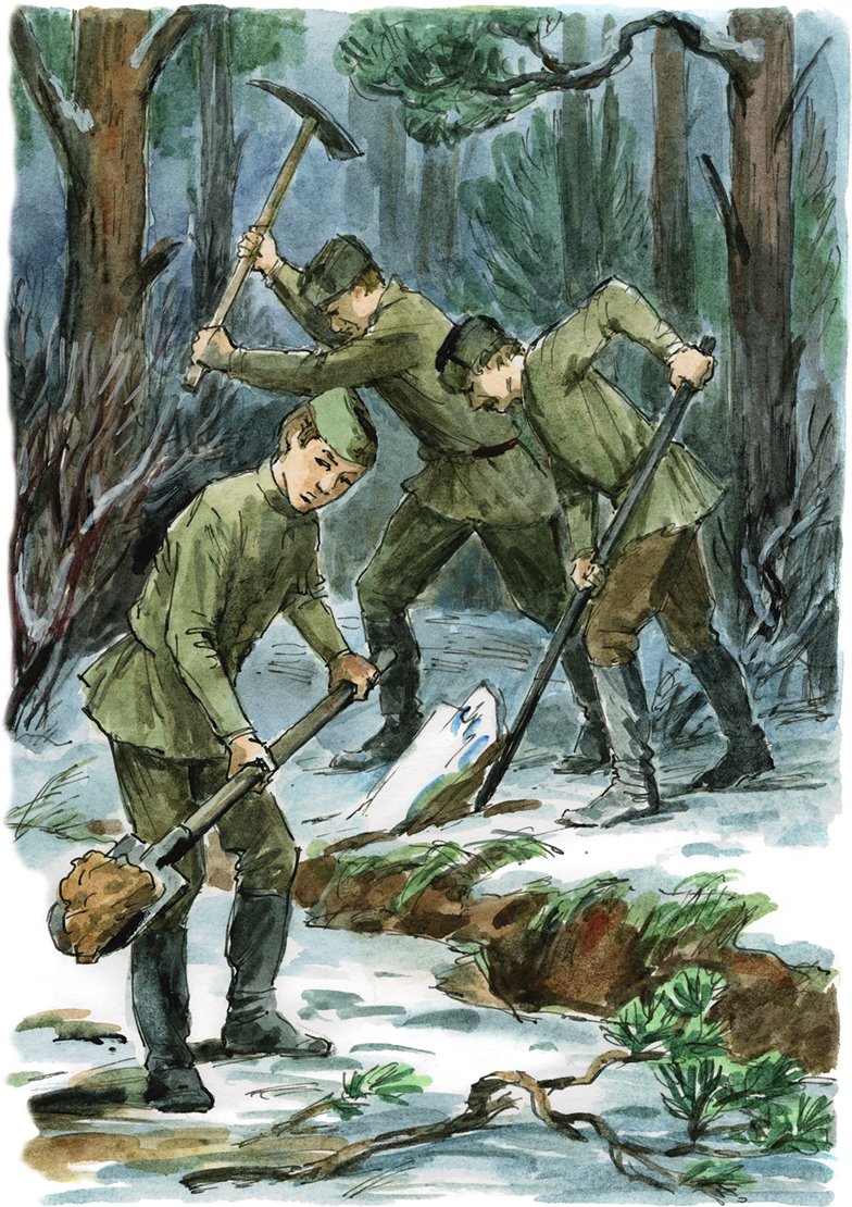 К солдатам пришёл старшина. Он сказал, что дивизион будет стоять тут не меньше недели, поэтому надо строить землянки.