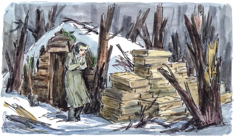 Вместе с другими солдатами Митя пошёл рубить слежки[1]. Слежки клали одним концом на бревно, другим на землю – так же, как делают шалаш. Потом их закидали лапником, на лапник положили мёрзлые земляные глыбы, глыбы засыпали песком и для маскировки припорошили снегом.