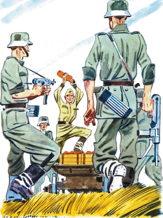 Враги ждали этого. Они хотели взять Сашу в плен. Автоматчиков было десять. Они сразу поднялись из травы и со всех сторон двинулись к повозке. В серо-зелёных мундирах с засученными рукавами, в касках – из-под них смотрели словно не человеческие, стеклянные глаза.