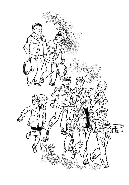За Вовой, точно прикрывая его, широко шагал Андрей, большеротый, коренастый и сильный, в вытертой кожаной куртке, в которых обычно ходят летчики гражданского флота. Куртка была ему в самый раз. В отвисшем кармане ее тоненько звякали шахматы в коробочке; с ней он не расстается, и то и дело от него слышно: «Сыграем?» И расставляет фигурки. Сильно играет: несколько ходов – и мат. За Андреем, толкая друг друга, торопились неразлучные Митя с Витей. У первого лицо репкой – круглое, светлое; у второго – будто морковка. Вытянутое, розовое. Рядом – Стасик, самый низенький в классе, даже девчонок таких не было; однако ни рост, ни писклявый голос не помешали ему получить бронзовую медаль, присужденную в Индии за один из его рисунков. Сбоку, в коротеньком, пронзительно красном, как пожар, пальтеце с деревянными палочками-пуговицами вприскочку бежала Наташка. Это ее пальтецо резало Борины глаза.