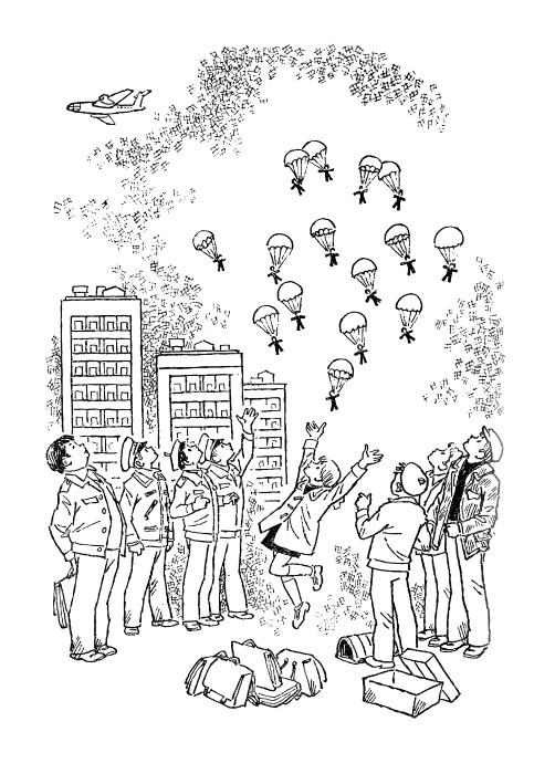 Под куполами на тоненьких стропах раскачивались человечки, ветер нес их чуть в сторону. Ребята с криком бросились ловить их.