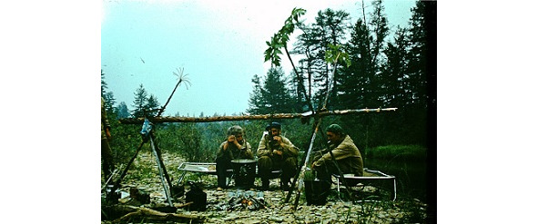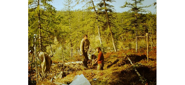 В это утро мы встали в пять часов и я с Анатолием Романовичем отправились на поиск реки. Речка Аверина течет где-то рядом и на ее берегах Ананьев надеялся найти какое-нибудь обнажение. Идем налегке. Я взял только фотоаппарат, он ружье. Спускаемся с крутояра и вместо реки попадаем на новое болото. Начинается новое блуждание. Ищем реку, а пока мокнем в ее заболоченной пойме. После трех часов поиска, так и не найдя реки, возвращаемся к месту стоянки.