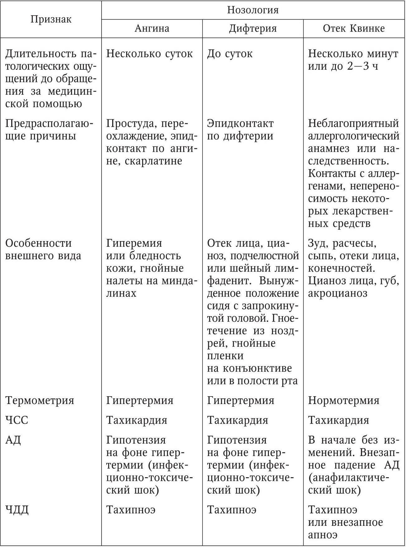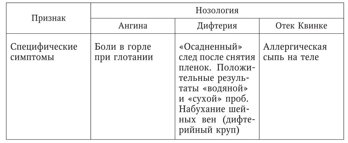 Гипертермия, односторонняя или двусторонняя припухлость (отек) и лимфаденит шеи, гнусавость голоса (дисфония) и скрежещущее дыхание характерны для тяжелого течения ангины, осложненной заглоточным абсцессом, а также для дифтерийного крупа. При этом со стороны ротоглотки в обоих случаях выявляется гиперемия и гипертрофия миндалин (при ангине чаще с одной стороны, при дифтерии с обеих сторон) и наличие отеков. Для отличия дифтерийных пленок от гнойных лакунарных налетов и пробок можно использовать сухую и водяную пробы. Сухая проба состоит в растирании пленок ложечкой по дну стеклянного (фарфорового) блюдца, при этом кожистая дифтерийная пленка в отличие от гнойного ангинозного налета не крошится. Для водяной пробы пленку или налет помещают в стакан с водой комнатной температуры, при этом дифтерийная пленка тонет в воде, а гнойный налет всплывает на поверхность. Кроме того, после отделения дифтерийной пленки на миндалинах остается осадненный кровоточащий след, что не характерно для ангины.