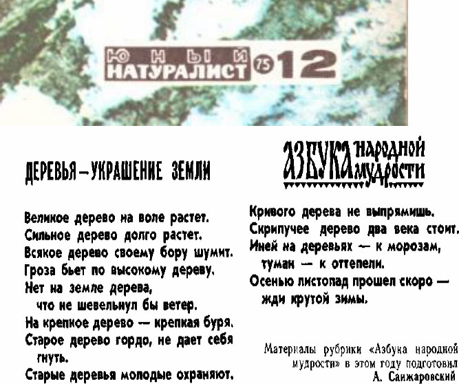 С ранней молодости я 47 лет собирал пословицы и поговорки о лесе и его обитателях, о родной природе и бережном отношении к ней, об её охране. Получилась своеобразная экологическая энциклопедия.
