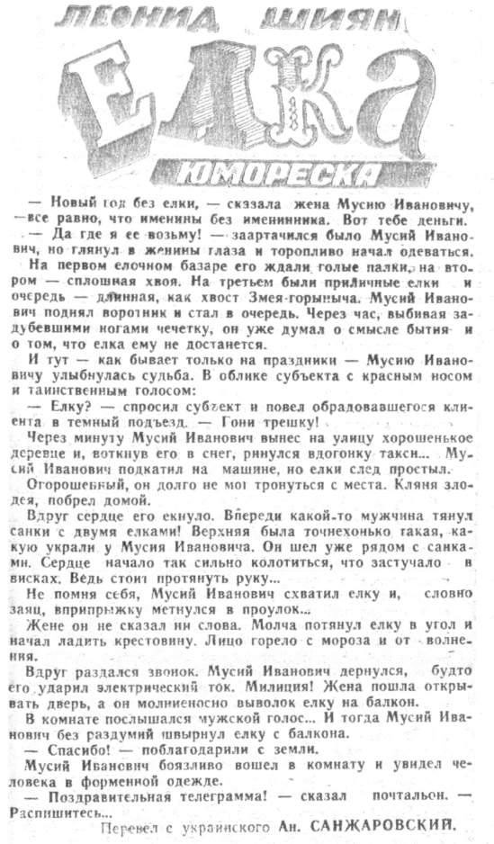 – Новый год без елки, – сказала жена Мусию Ивановичу, – все равно, что именины без именинника. Вот тебе деньги.