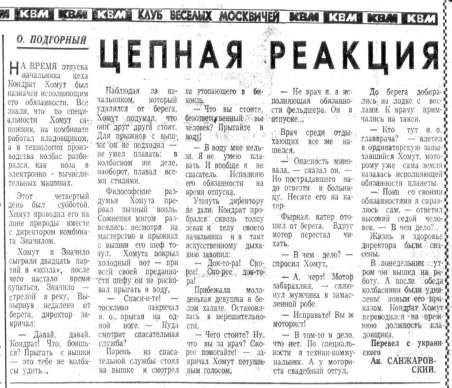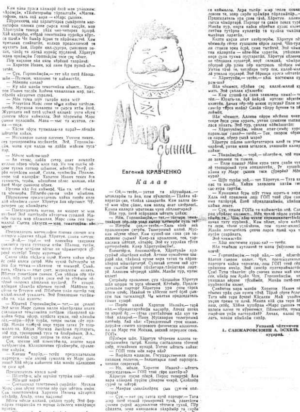 Сначала рассказ Е. Кравченко я перевел с украинского на русский. Затем мой текст перевел на чувашский чебоксарский писатель Аркадий Эсхель. Двойной перевод опубликовал чувашский журнал сатиры «Капкан» (№ 17 за 1962).