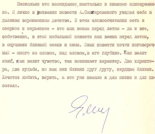 "Небольшая Ваша повесть – это в высшей степени серьёзное и интересное литературное произведение. Ваша повесть сама по себе заслуживает всяческого одобрения".