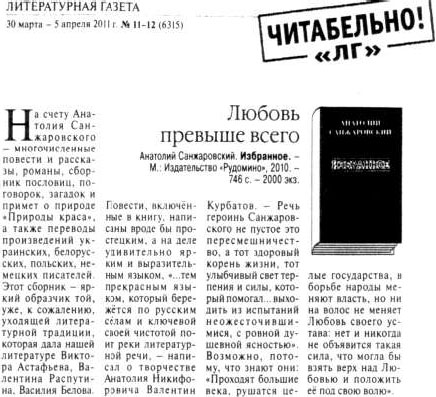 На примере этого однотомника о достоинствах моей прозы писала и «Литературная газета» на полосе ЧИТАБЕЛЬНО! ЛГ» («Литгазета», №№ 11–12 от 30 марта – 5 апреля 2011, страница 7). Речь о рецензии Алекса Громова «Любовь превыше всего». Как информировала «Литературка» на первой странице 26 апреля 2011 года, «гриф «Читабельно!» ставился только на книги, противостоящие рыночной стихии, защищающие честь и достоинство русской и мировой литературы».