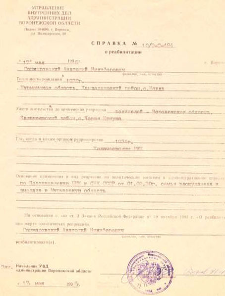 «Разъясняется, что Санжаровский Андрей Дмитриевич, 1872 г. рождения, уроженец и житель с. Н – Криуша Калачеевского р-на ЦЧО (Воронежской области) по Постановлению тройки при ПП ОГПУ ЦЧО подвергался репрессии по политическим мотивам, по ст. 58–10 УК РСФСР к 3 годам заключения в концлагерь.