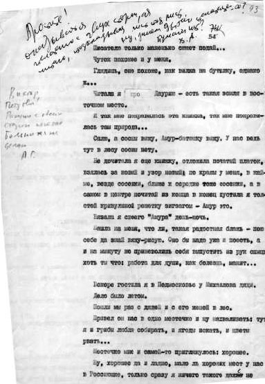 Страница рукописи «Оренбургского платка» с «выговором» В.П. Астафьева: «Простите! Оказывается, печатано с двух сторон, а я читаю, подкладывая лист под лист. Ну, зачем Вы так печатаете-то? Бумаги нет? В. А.». Тут же, на полях, чуть ниже я прилепил свое карандашное покаяние: «Виктор Петрович! Раньше печатал с обеих сторон. Больше так не делаю. А.С.».