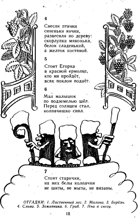 В лесу1Зимой с седой бородой,летом новая вырастает,осенью отпадает.2Красненька Матрёшка,беленько сердечко.3На полянке девчонкив белых рубашонках,в зелёных полушалках.4Снесли птичкисиненьки яички,развесили по дереву:скорлупка мяконька, белок сладенький,а желток костяной.5Стоит Егоркав красной ермолке,кто ни пройдёт,всяк поклон подаёт.