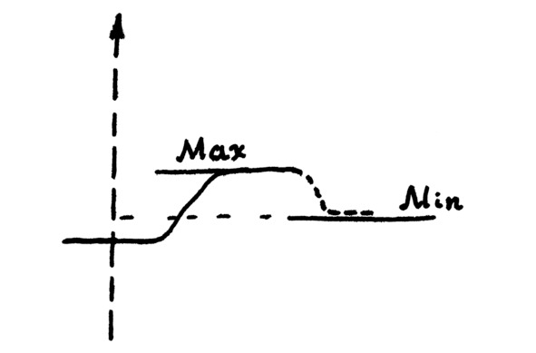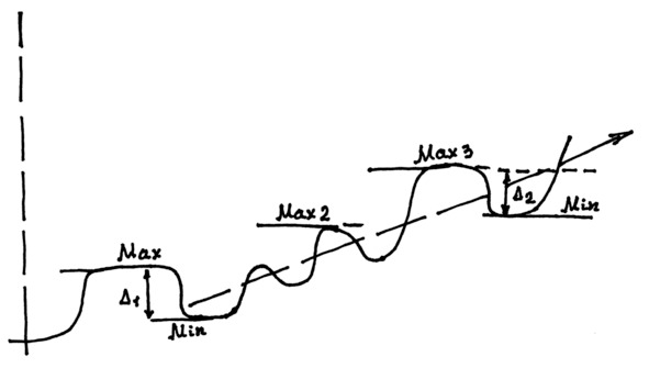 Развитие совершается не прямолинейно, а циклично, по спирали или волнообразно по поднимающейся вверх волне. Чувство Гармонии возникает на максимуме в ментальной и витальной чувственной сфере. Ментальное и витальное не обладают изначальной истиной и не являются чистыми, поэтому максимум сменяется минимумом, относительной депрессией. Всякий последующий минимум всё же выше предыдущего минимума, и переносится легче (рис.2).