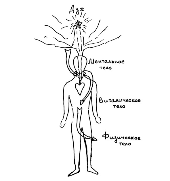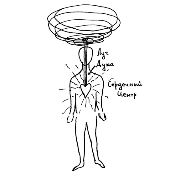 Конкретизируя задачу, можно сказать далее, что основная работа состоит в подготовке всех тел природной души и Разума к принятию Божественного Духа. Здесь следует пояснить терминологию, поскольку в Йоге говорят и о душе Божественной. Я же читал лекции в понятиях и терминологии той школы, где я учился Йоге. Так вот под душой человеческой-! природы понимается физическое, виталическое (вместе с эфирным), ментальное (вместе с казуальным) тела. В то же время Божественная душа – это Монадический луч с Божественной искрой в сердце (рис.13). Итак, мы имеем душу человеческой природы и Душу Божественную. Нисходящий поток Божественного означает присутствие Духа (от Монады).