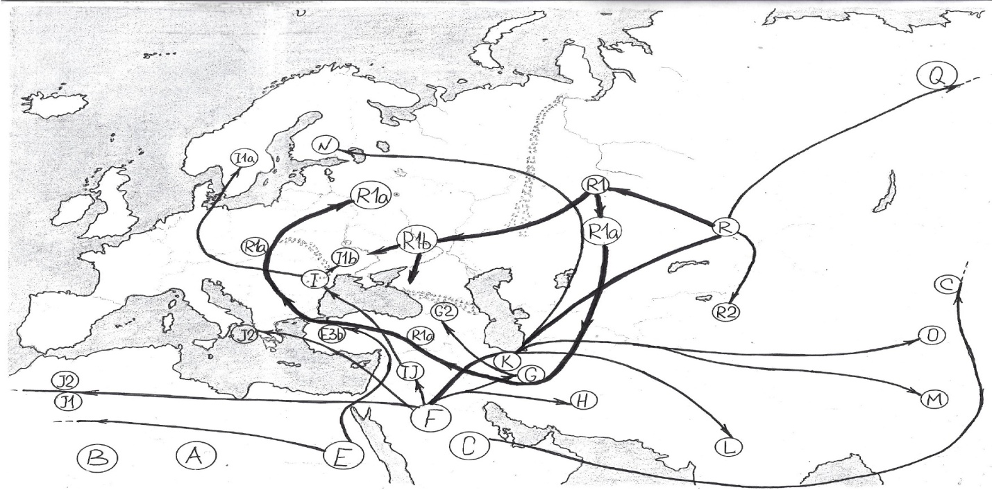 Основных волн миграций рода R1b было две: более древняя – прямо на закат солнца через Урал, до Волги и до Дона; и через временную паузу в тысячи лет, когда потомкам этого рода становится тесно на освоенных пространствах, и когда основная их часть начинает, опять-таки тысячелетнее, движение по огромной дуге от Северного Причерноморья, Нижнего Поволжья через Кавказ на Ближний Восток и в Малую Азию и далее через Северную Африку до Гибралтара и уже оттуда на Пиренеи и в Западную Европу. В этих немыслимых, казалось бы, гигантских перемещениях по Евразии обоих родственных родов на самом деле нет ничего необычного для палеоэтнографии. Еще больший «крюк» закладывают носители гаплогруппы Q, которые, где-то с периода 35-30 тысяч лет назад, начинают масштабное, растянувшееся также на тысячи, десятки тысяч лет, переселение, но уже на восток и северо-восток – до Чукотки и Берингова пролива (который на ту пору был, очевидно, сушей). Оттуда они распространяются по всей Америке, вплоть до Огненной Земли. Сегодня американские индейцы – это потомки тех переселенцев. А уж как и на чем добирались носители гаплогрупп О и С до бесчисленных архипелагов Тихого океана то загадка еще на века! Кстати, эти древнейшие гаплогруппы также происходят из центра Евразии – вот где получается колыбель человечества!