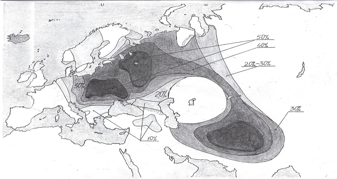 2. Гаплогруппа N1a. Ее принято называть финно-угорской, хотя данное понятие не этническое, а, скорее, лингвистическое, то есть имеется в виду принадлежность носителей данной метки в своих Y-хромосомах по языку к данной языковой семье. Это, скорее, уральская, или же зауральская гаплогруппа. Считается, что гаплогруппа N появилась «всего» 20-15 тысяч лет назад в Юго-Восточной Азии, благодаря мутации в предковой для нее гаплоруппе NO. Потомки рода N постепенно мигрировали от Северного Китая в основном, в сторону Урала, а уже оттуда в Восточную и Северную Европу. Субклад N1a1, определяемый у 15-20% этнических русских, появился 12-8 тысяч лет назад где-то на Среднем Урале. В Поволжье носители этой гаплогруппы появляются 7,5 тысяч лет назад, а в районе Балтики-Финляндии и на русском Севере только 3-2,5 тысяч лет назад. Гаплокарта представлена на схеме 4.