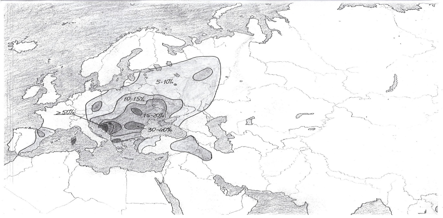 3. Гаплогруппа I2a. Считается палеоевропейской, автохтонной, то есть «местным» чисто европейским субкладом, возникшим 27 тысяч лет назад от мутации в роду I. Особенно распространена в том числе, среди балканских славян, у украинцев ee до 20%. Гаплокарта представлена на схеме 5.
