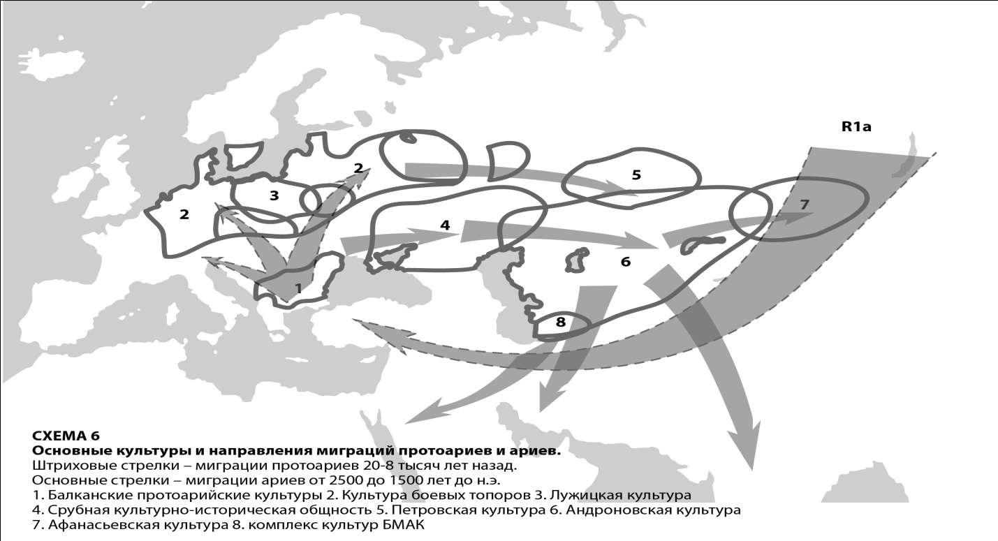 Наступила пора разобраться с терминологией. Род, гаплогруппу R1b проф. Клесов остроумно обозначил как «эрбины» по простому созвучию с русским «эр-один-бэ». Забегая вперед, скажем, что потомки рода R1a со временем доберутся от Восточной Европы до пределов Индии и Иранского нагорья, где оставят нам свои рукописные поэмы «Авеста» и «Ригведа», из которых мы и узнаем об их самоназвании – арии, и что так они называли себя, по крайней мере, с середины II-го тысячелетия до н.э. и, несомненно, еще гораздо ранее. Иран – это транскрибированное от «арий», высшие касты Северной Индии на 70% состоят из носителей гаплогруппы R1a – ариев. Царь персов Дарий в свое время с гордостью велел высечь в камне: «Я Дарий – арий, сын ария». Завоеватели как назначили себя «первым сортом» еще 3,5 тысячи лет назад, так им и остаются поныне. Итак, далее у нас так и пойдет: род, гаплогруппа R1a – это арии или протоарии в зависимости от периода и эпохи (кстати, совпало и по созвучию – «эр-один –а»).