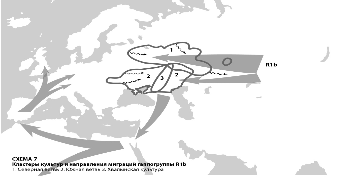 К IV-му тысячелетию до н.э. потомки сибирских мигрантов рода R1a широко распространились по всей северной части Европы – от предгорьев Альп до юга Скандинавии и по широте от берегов Северного моря до верховьев Волги. Группу археологических культур, образованных ими, принято называть культурно-историческим сообществом (КИО) культуры шнуровой керамики-боевых топоров (по обычаю сопровождать покойного в захоронении каменным топором ладьевидной формы) – в дальнейшем КШК – №2 на схеме 6. КИО боевых топоров не только была крупнейшим подобным догосударственным образованием древних племен всех эпох, но и существовала также рекордно долго – более тысячи лет. По эпохам это конец энеолита – начало бронзового века.