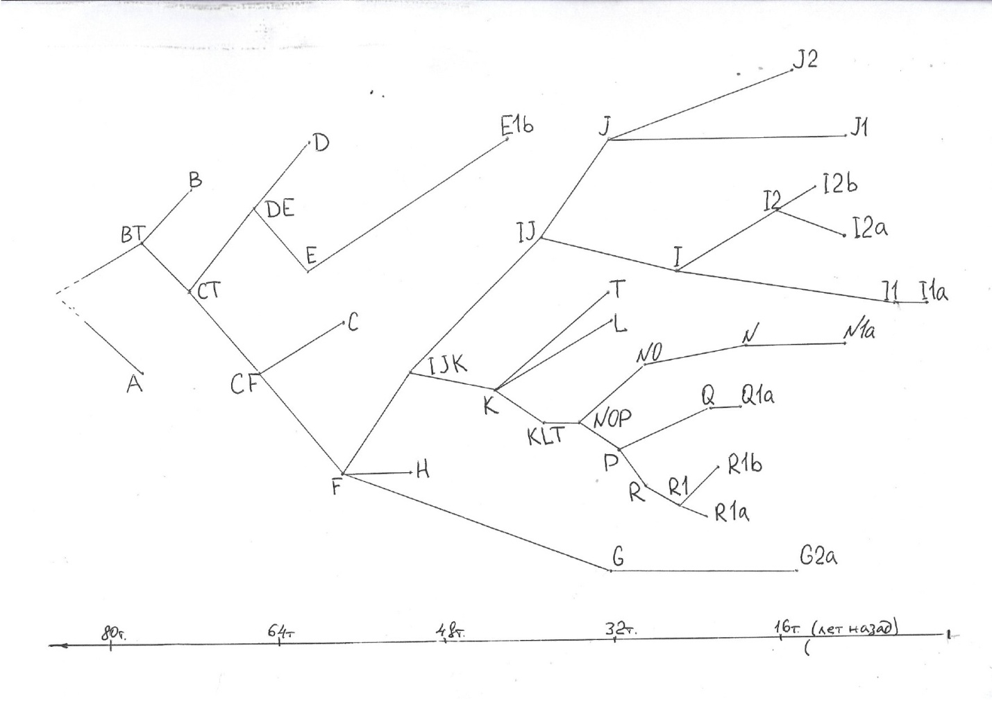 Теперь подробнее. Когда-то, у жившего 25-20 тысяч лет назад праотца рода R, появился прямой потомок с генетической меткой R1, то есть произошла мутация в ДНК, а у того, через определенное время (это могло быть сразу, во втором поколении, а могло и через десятки поколений) свои «сыновья», но уже, соответственно, с метками R1a и R1b. Связка «сын-отец» здесь применена условно, речь фактически идет не о прямых родственных связях, а о мутации в ДНК, проскочившей в этом роду на определенном этапе и зафиксированной исследователями генетического материала. Человек с этой мутацией в генах становится родоначальником следующего гаплотипа со своей маркировкой, в данном случае R1a и R1b. Сегодня для каждого конкретного человека при его идентификации по родственным связям приходится вслед за начальными литерами R, или Q, или N и т.д. выстраивать цепочку из десятков дополнительных символов. Но нам для изучения древних миграций вполне достаточно первых двух-четырех.