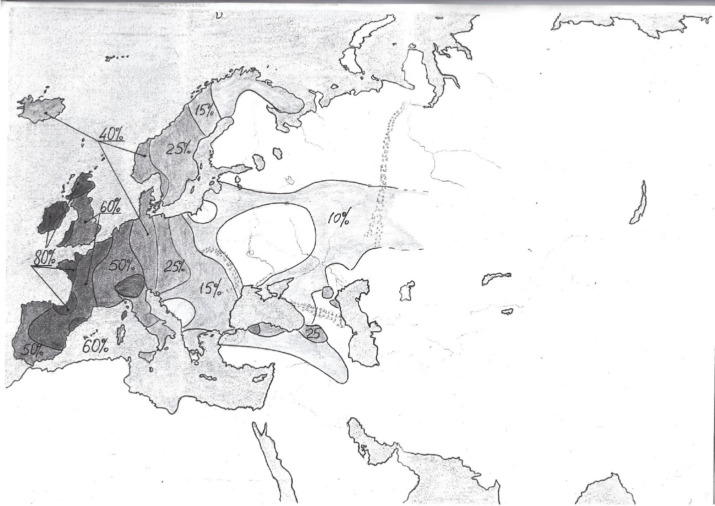 Эти 20 родов ученые обозначили латинскими буквами от А до T. На схеме 1 показано современное представление о локализации изначальных родов человечества и путях их последующих миграций [6]. На схеме 2 отображена своеобразная лестница постепенного разделения родов, их основные субклады (основные ветви) – или же «филогенетическое древо». Этнические русские являются, в основном, потомками следующих родов, или гаплогрупп, как их называют генетики (в порядке убывания): R1a, N1а1, I2a, I1, R1b [7]. На схемах 3-7 (взяты на сайте www.hahlogroup.narod.ru/eur-hap.html) показаны так называемые гаплокарты, или же плотность распределения указанных родов в Европе (современное состояние). Здесь индексы и буквы после заглавной литеры означают последовательное разделение первородов на боковые, дочерние (вернее, сыновние) ветви. Приведём некое усредненное распределение русского населения Европейской России (мужской ее части) по отношению к древним гаплогруппам: доля потомков рода R1a составляет 47%, R1b – 6%, рода N1c1 – 20%, J2 – 3%, G2a3 – 4%, I1 – 5%, I2a – 10%, E1b1 – 5% [7]. Можно сказать, что в среднестатистическом русском присутствует замес из вот такого соотношения гаплогрупп. Или иначе: русский этнос сформировался в течение тысячелетий именно из этих основных родов с превалированием рода (гаплогруппы) R1a. Приведённое процентное соотношений достаточно условное и усреднённое, так, доля «ведущей» группы R1a возрастает в направлении с севера на юг и ниже широты Москвы и Тулы составляет уже 60 и более процентов с соответствующим уменьшением доли финно-угорской группы N1а1. Ясно, что на Северном Кавказе распределение населения по родам (предкам) совсем иное, чем в Архангельске.