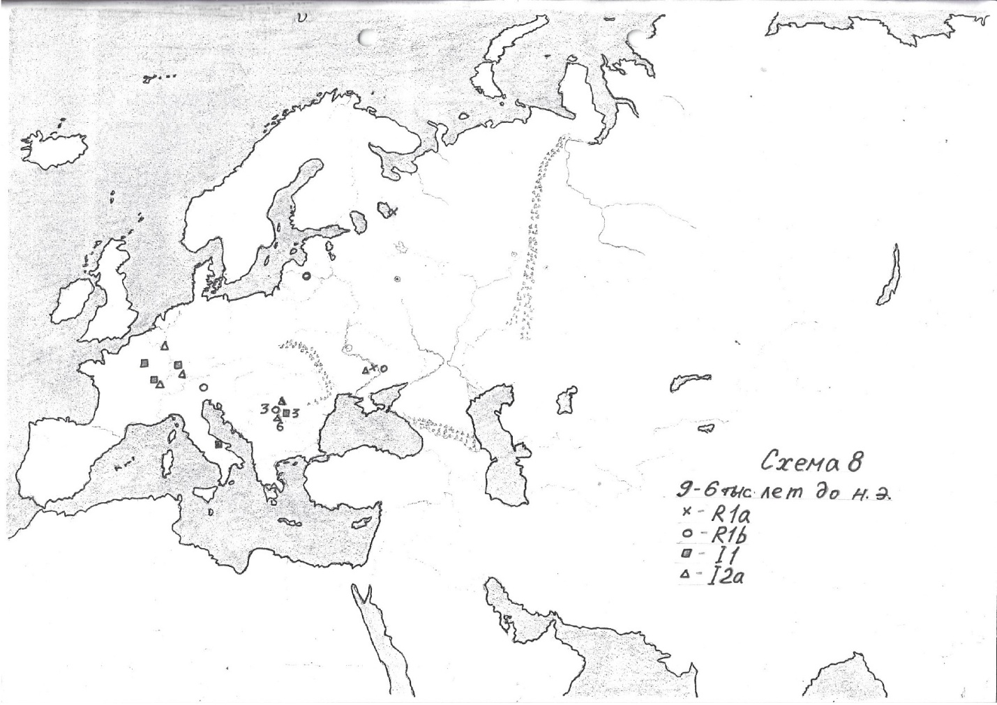 Схема 9. Ископаемые ДНК (6-4 тыс. лет до н.э.) по мужской Y-хромосоме (составлено автором – Овчинников А.Н.).