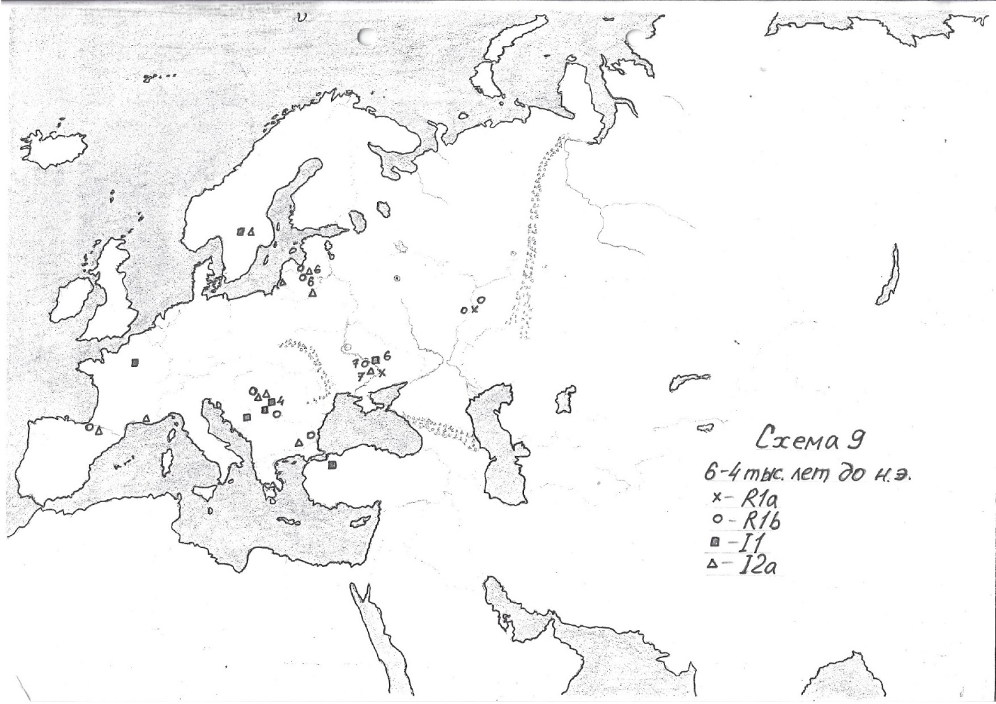 Рассмотрим следующий временной диапазон от 6 до 4 тысяч лет до н.э. – схема №9. Палеоевропейские гаплогруппы I, I1, I2a, I2a2 появляются в Прибалтике, в Скандинавии, на Пиренеях, обитают по-прежнему на Балканах и на Среднем Днепре. Данный факт говорит, с одной стороны, о дальнейшем расселении автохтонных европейских родов, но, с другой, нельзя исключать возможности их изначального пребывания в указанных зонах Европы, просто более ранние следы в виде ископаемых останков пока не обнаружены. Протоарийская гаплогруппа R1a выделена у семи образцов опять-таки на Среднем Днепре, что может говорит как о дополнительной миграции носителей данной метки с востока, так и о простом развитии этноса, сформировавшегося на предыдущем этапе. А вот фиксация носителя R1a на Средней Волге с ориентировочной датировкой середина 5-го тысячелетия до н.э. похожа на след от подобного передвижения протоарийского рода в сторону Русской равнины. Хотя в [21] по этому поводу сделано замечание о слишком ранней полученной датировке для возможной реверсивной миграции R1a из Восточной Европы, и к тому же по особенностям расположения скелета в захоронении делается вывод о принадлежности этого носителя «арийской» гаплогруппы к племени «эрбинов», или же носителей гаплогруппы R1b. Надо понимать, что генетическая и этническая принадлежность – это разные категории.