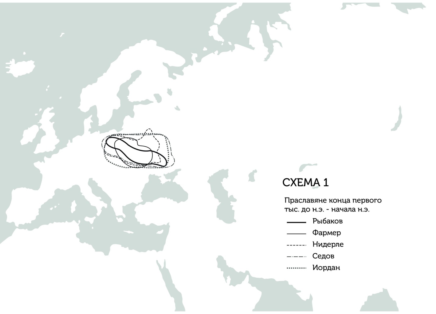 В работе [4] сделана попытка объединить картографически различные версии изначального славянского ядра. Из наложения карт распространения археологических культур, а также карт, составленных по различным источникам (античные авторы, работы известных ученых) вырисовывается некий единый центр опять-таки в районе Карпаты-Средний Днепр. Добавим сюда схемы расселения ранних славян по указаниям Повести временных лет (ПВЛ), а также по работам известных ученых-славистов чеха Л. Нидерле, поляка Сплавинского и некоторых других (в указанной работе они также представлены) и убедимся: наложение и этих карт опять-таки указывает на некое общее ядро в том же районе – схема 1. Любопытно…