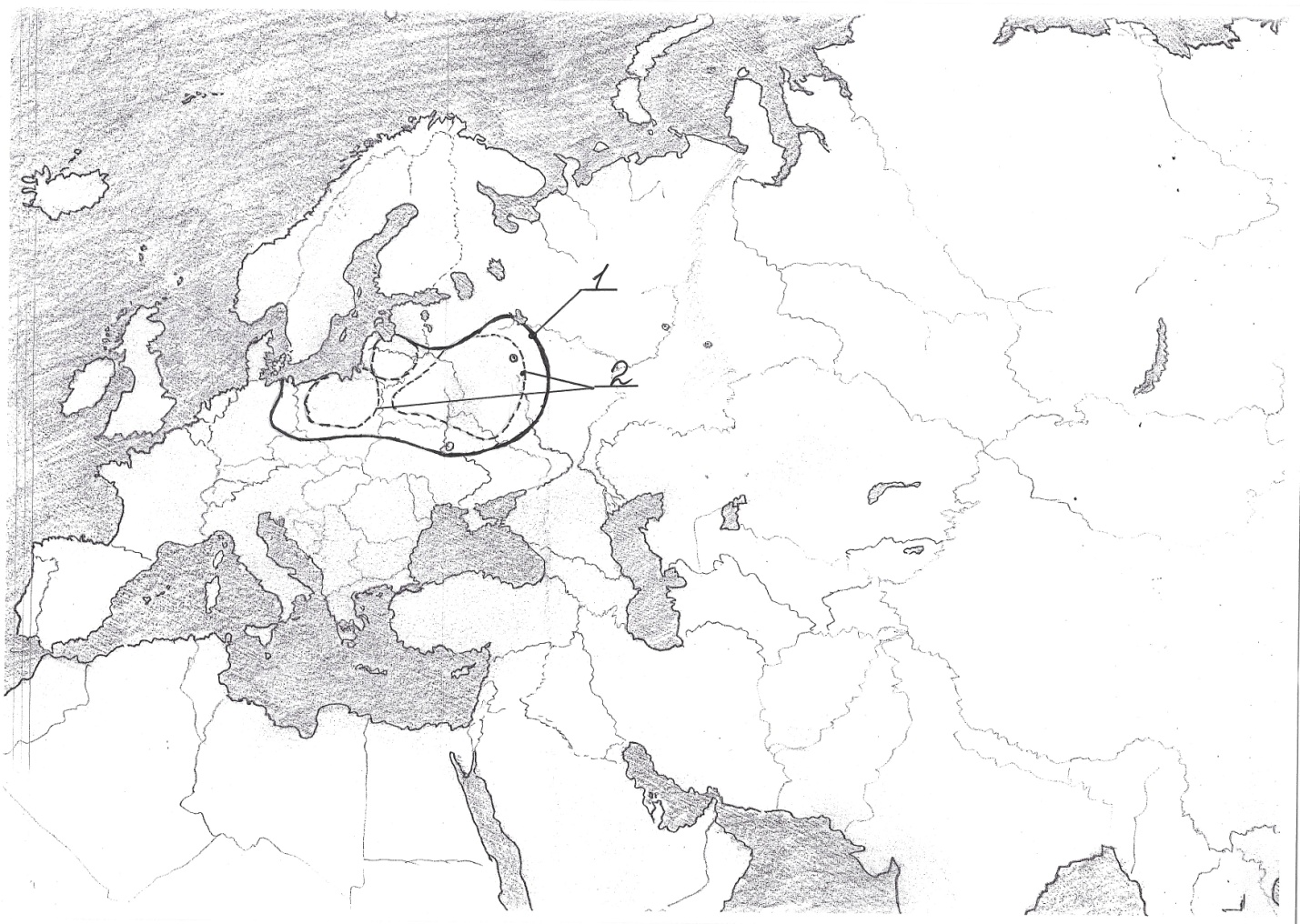 Схема 3. Ареал расселения балтов на рубеже Эр: 1 – наиболее «оптимистические границы»; 2- отдельные регионы по воззрениям «умеренных» исследователей (составлено автором – Овчинников А.Н.).
