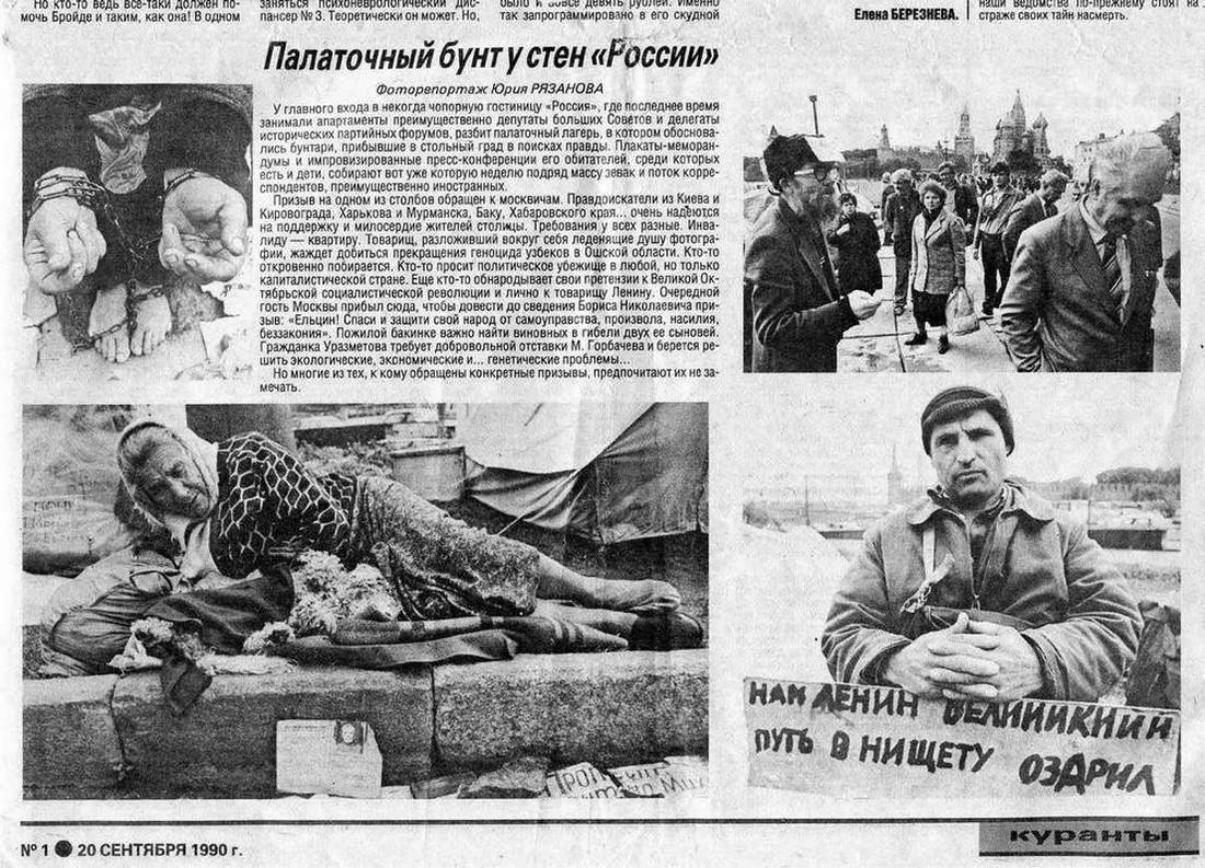 Этот фоторепортаж о палаточном бунте недалеко от стен Кремля опубликован в первом номере «Курантов» (20 сентября 1990 г.). Уже была «перестройка», но – при коммунистической власти. Многим советским людям и жить было не на что, и есть было нечего…