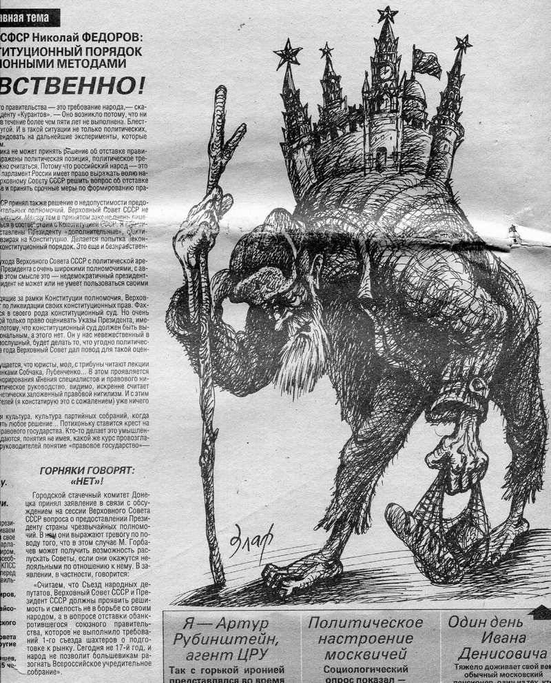 На горбу советских «рабов» держалась кремлёвская власть. («Куранты», 27 сентября 1990 г. Автор рисунка – Михаил Златковский.).