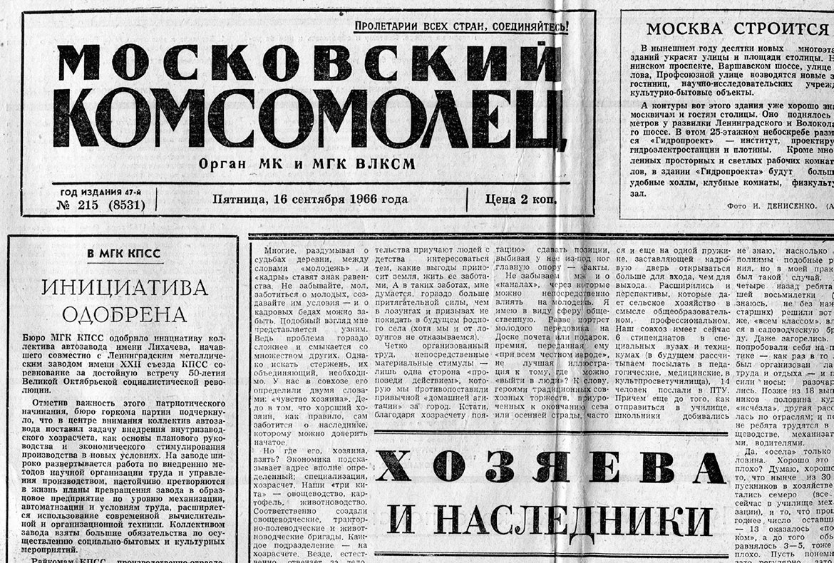 Летом 1966 года моя однокурсница Лена Журавская, видя мои колебания, чуть не за руку привела меня в «Московский комсомолец». Она работала в спортивном отделе, а доверила меня отделу пропаганды, убедив, что там «отличные ребята», и, судя по моей биографии, тематика для меня подходящая. Ребята – исполнявший обязанности заведующего отделом Володя Чернов и его правая рука Лёна Коренев – дали мне задание. Я потратил на него свой учительский отпуск и в сентябре стал штатным сотрудником «МК».