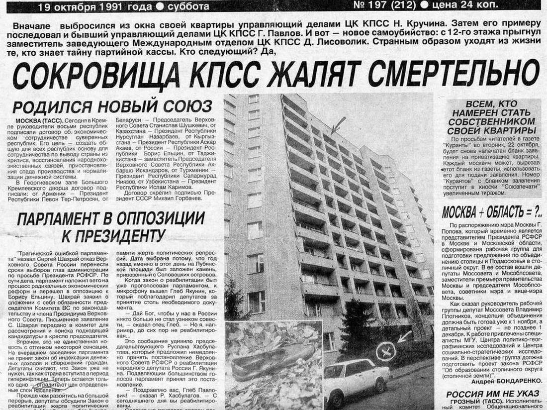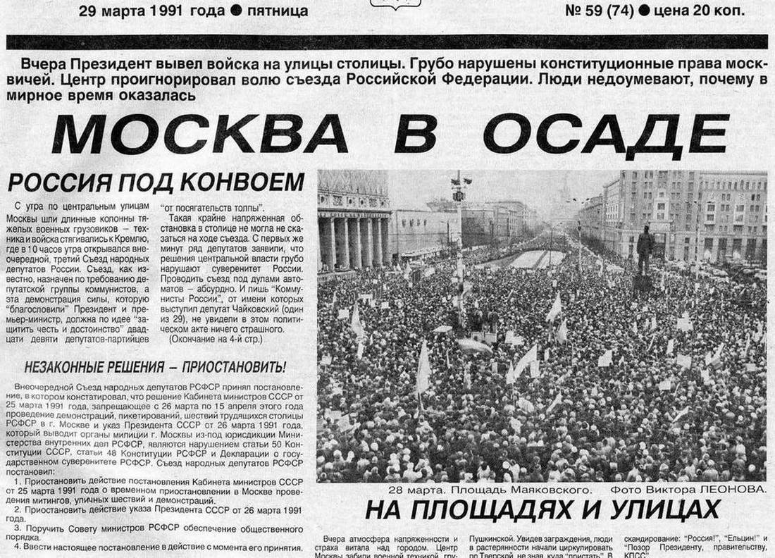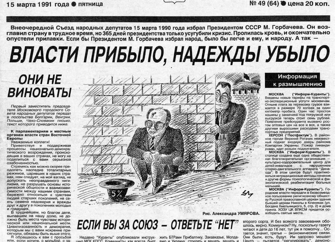 Митинговали в 90-е много. Всякие, с разными лозунгами. В левой части газетной страницы – репортаж о митинге защитников горбачёвского, то есть коммунистического режима, в правой – сторонников реальных демократических преобразований… Для меня так и осталось загадкой, почему последний советский маршал, министр обороны СССР Дмитрий Язов читал газету «Куранты» во время митинга и что он там вычитал. Видимо, неглубоко проник в курантовский текст, иначе полгода спустя не присоединился бы к заговорщикам из ГКЧП и не попал бы на лефортовские нары. («Куранты», 26 февраля 1991 г.).