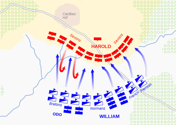 Такое расположение войск Вильгельма предполагало, что он планировал начать битву с обстрела лучниками, а затем ввести в бой пехоту, которой была поставлена задача прорвать стену из щитов и образовать коридор для ввода тяжелой кавалерии.