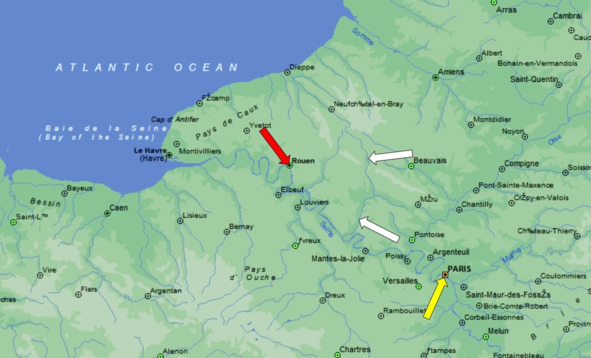 Река Эпт (белые стрелки), Руан (красная стрелка), Париж (желтая стрелка)