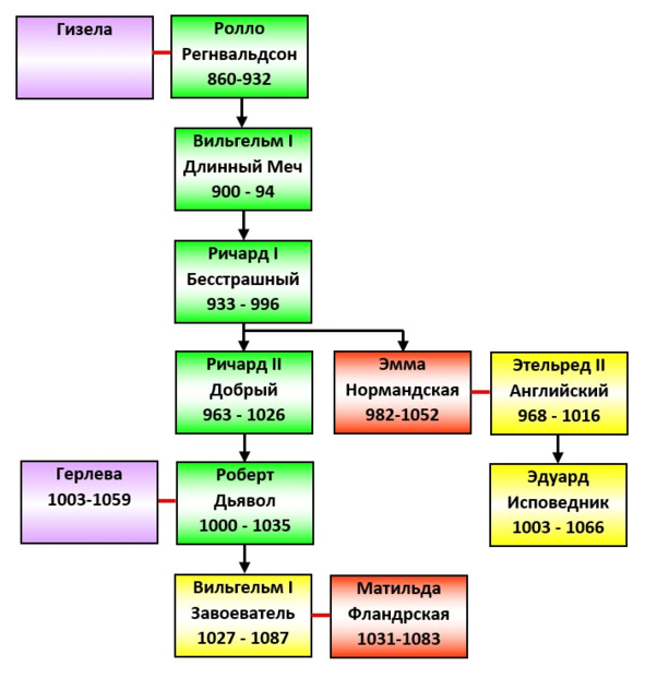 Нормандская династия (короли обозначены желтым цветом, королевы – красным, герцоги Нормандии – зеленым)