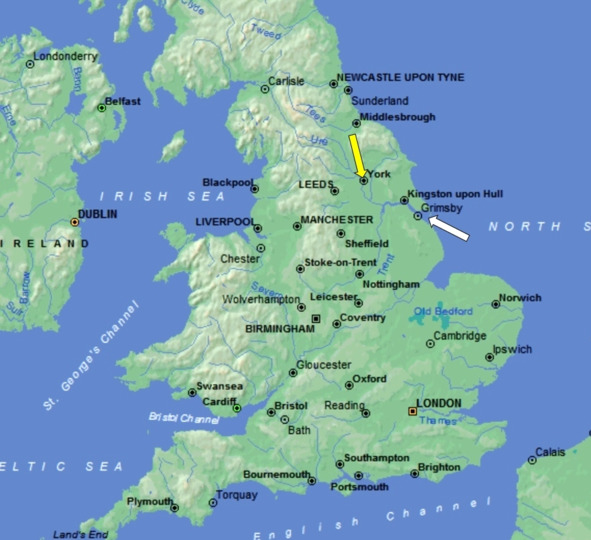 Йорк (желтая стрелка), устье реки Хамбер (белая стрелка)