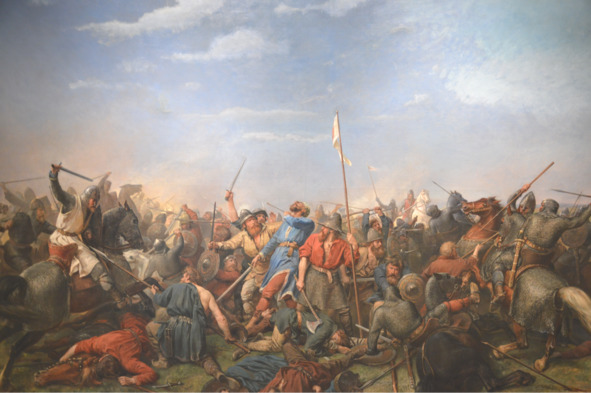 Гибель Гарольда Гардрады в сражении у Стэмфорд-Бридж. Норвежцы изображены в шлемах, но без доспехов. Художник Петер Николай Арбо (1831—1892)
