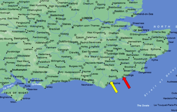 Певенси (желтая стрелка), Гастингс (красная стрелка)