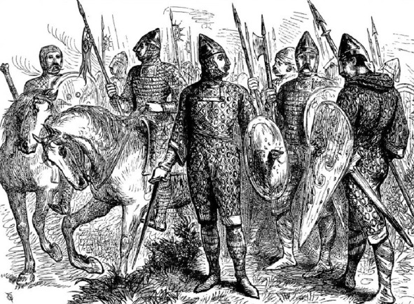 Точное количество воинов в армии Гарольда неизвестно, и ее численность невозможно оценить даже приблизительно. Она состояла исключительно из пехоты. Только самые знатные англо-саксы прибыли на поле верхом, но затем спешились и заняли места в общем строю. Элитными частями являлись отряды хаускарлов.* Их доспехи состояли из конического шлема, кольчуги и щита, как правило, круглой формы. Они предпочитали сражаться «датским боевым топором» с длинной рукоятью, но многие также имели мечи. Основную же массу войска составляли ополченцы в более легком снаряжении.
