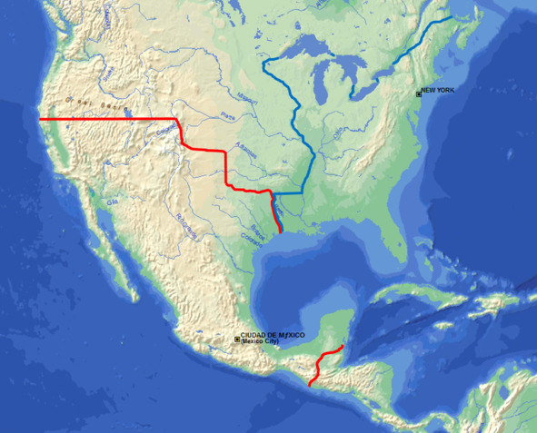 Границы провозглашенной в 1824 году республики Мексика – красные линии. Границы в том же году США – синие линии (территория к югу и востоку от этих синих линий).