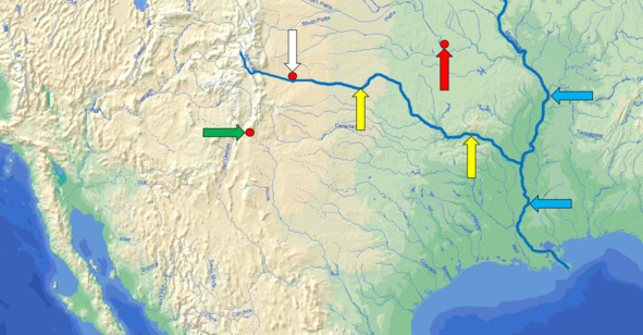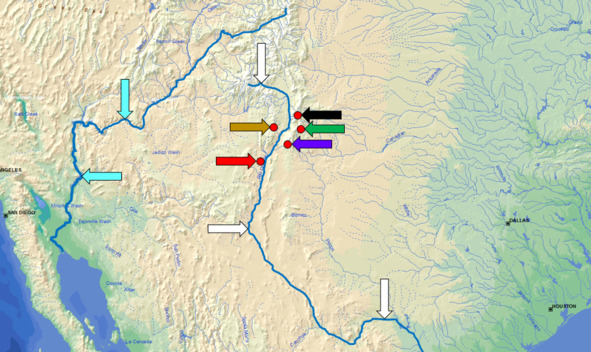 Альбукерке (красная стрелка), Санта-Фе (сиреневая стрелка), Эмбудо (черная стрелка), Трампас (зеленая стрелка), Фернандес (коричневая стрелка), река Колорадо (голубые стрелки), река Рио-Гранде (белые стрелки)