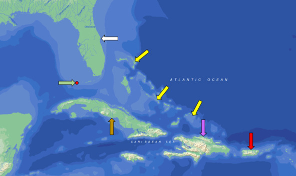 Пуэрто-Рико (красная стрелка), Багамские острова (желтые стрелки), Куба (коричневая стрелка), предполагаемое место, где де Леон вышел к западному побережью Флориды (белая стрелка), остров Эспаньола (сиреневая стрелка), острова Драй Тортугас (зеленая стрелка)