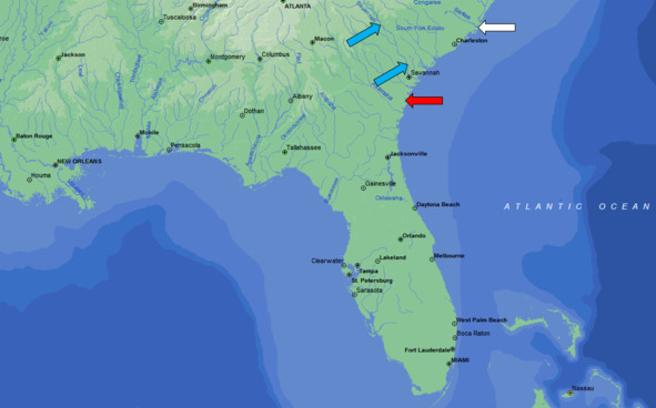 Место первоначальной высадки экспедиции Айлона (белая стрелка); предполагаемое место основанной де Айлоном колонии (красная стрелка), река Саванна (голубые стрелки)