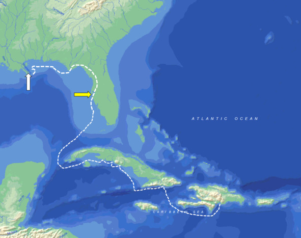 Предполагаемый маршрут экспедиции Нарваэса (белая пунктирная линия), залив Тампа (желтая стрелка), устье Миссисипи (белая стрелка)